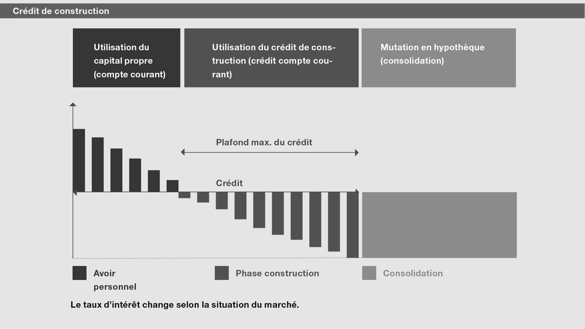 Pour construire, tu as besoin d'argent au fur et à mesure, pas tout d'un coup. Le crédit de construction te met à disposition une ligne de crédit fixe sous forme de compte de construction. Les intérêts ne s'appliquent qu'au montant que tu utilises réellement.