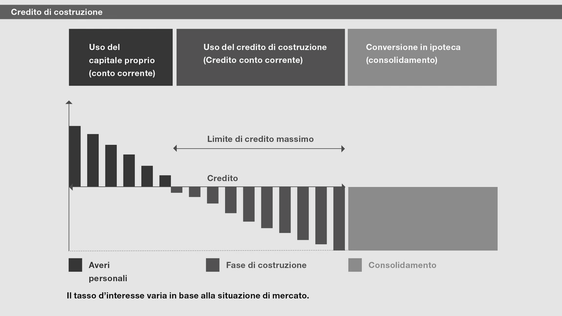Quando costruisci, hai bisogno di denaro quando ti serve, non tutto in una volta. Il credito di costruzione ti mette a disposizione una linea di credito fissa sotto forma di conto edilizio. Gli interessi vengono applicati solo sull’importo che effettivamente utilizzi.
